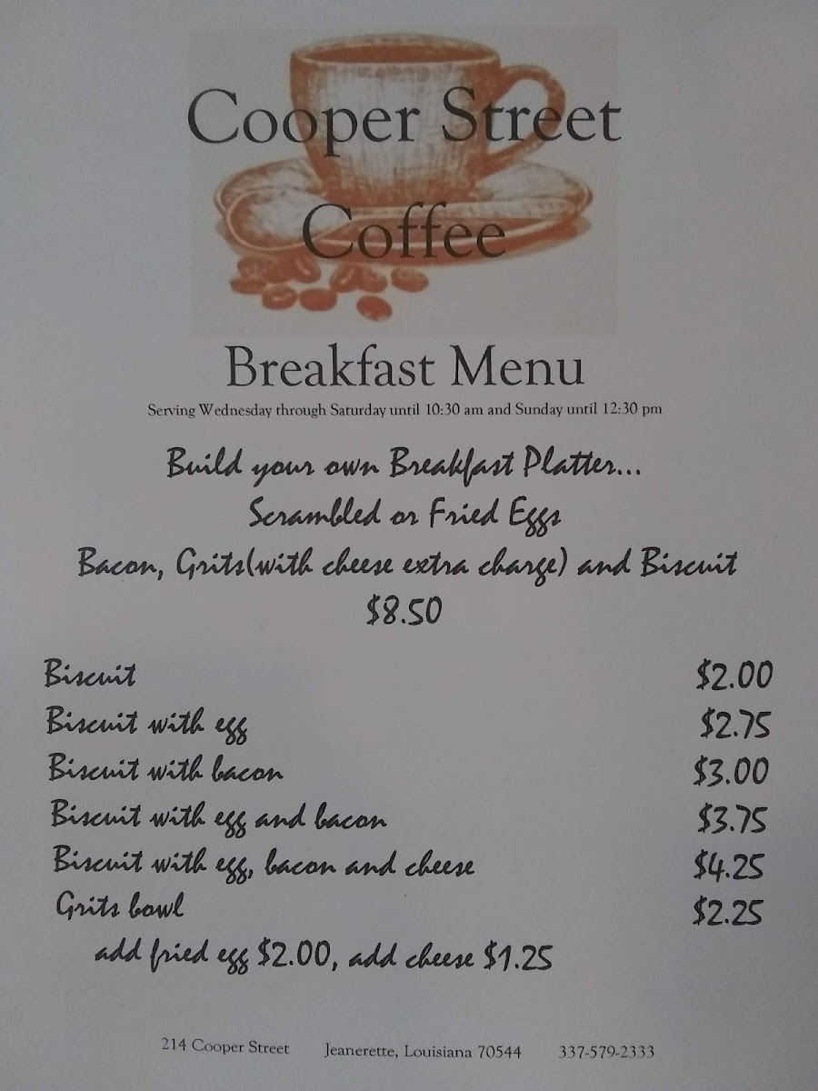 Introducing the menu at Cooper Street Coffee, located at 214 Cooper St, Jeanerette, LA, is a delightful experience that captivates food lovers and coffee aficionados alike. This charming cafe masterfully balances a cozy atmosphere with an extensive menu that makes it a perfect spot for breakfast or brunch.